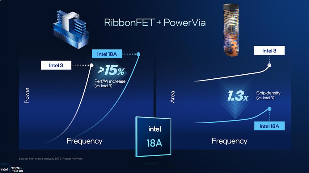 这主要得益于Intel 18A的两大杀手锏:RibbonFET晶体管和PowerVia背面供电。