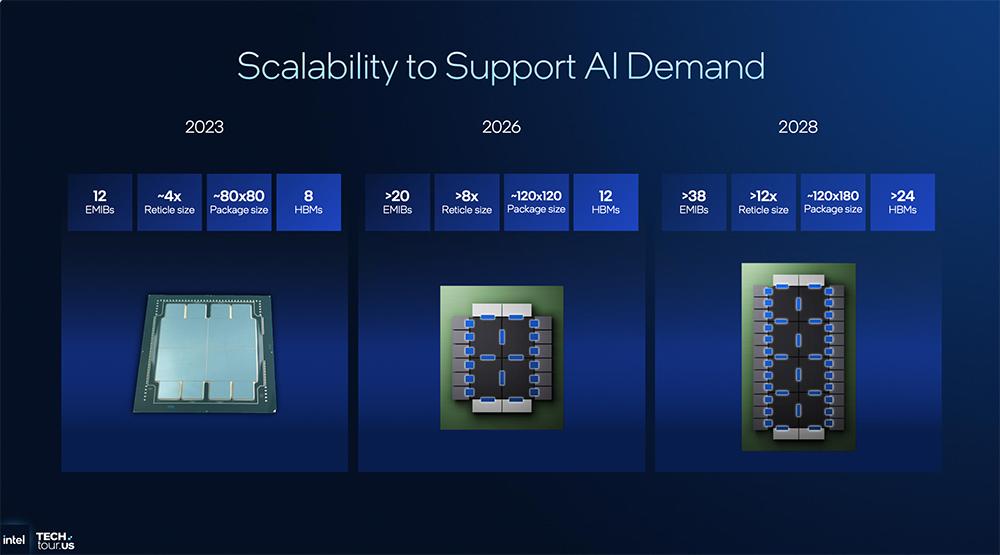 到2028年,>38 EMIB、>12x Retile size、封装尺寸120 x 180、>24 HBM。