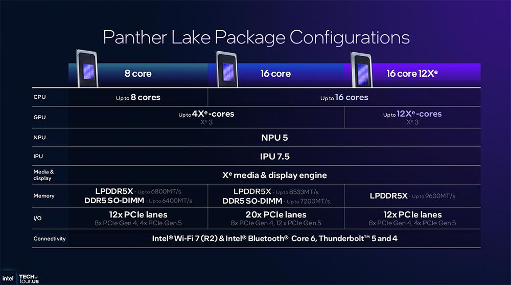 Panther Lake共有3个不同配置,分别是8核、16核、16核+12 Xe。三款产品用的是一个封装,以便客户做产品设计。