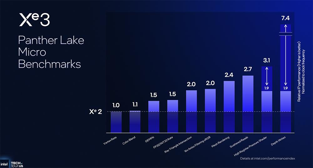 英特尔展示了Panther Lake在一些微基准测试上的性能提升表现。
