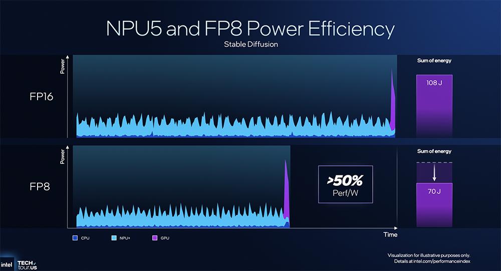 比如跑Stable Diffusion文生图模型,用NPU 5+FP8精度可以将能耗从108J降到70J左右,GPU一直到最后阶段才被用到,用于图像合成。