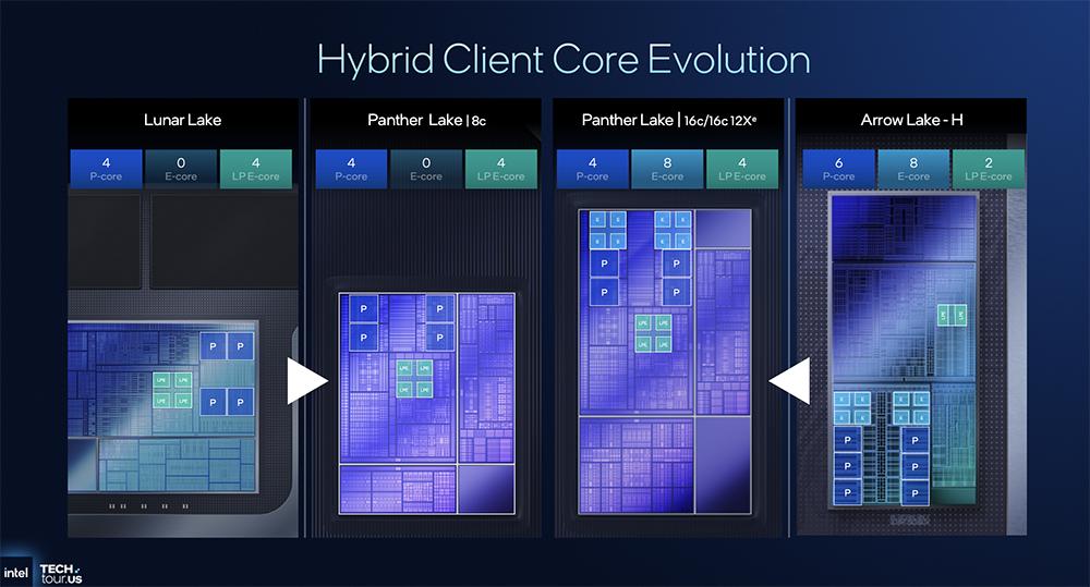 与Lunar Lake和Arrow Lake 相比,Panther Lake实现了更高的灵活性,8核配置可替代Lunar Lake芯片,16核配置可替代Arrow Lake-H芯片。