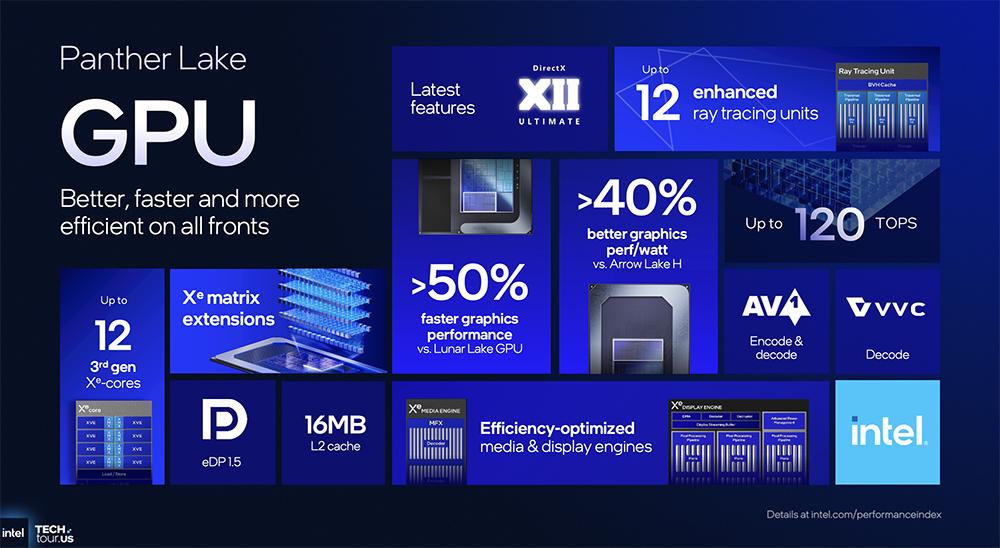 相比上一代,Panther Lake实现图形性能提升50%,每瓦性能提升40%。
