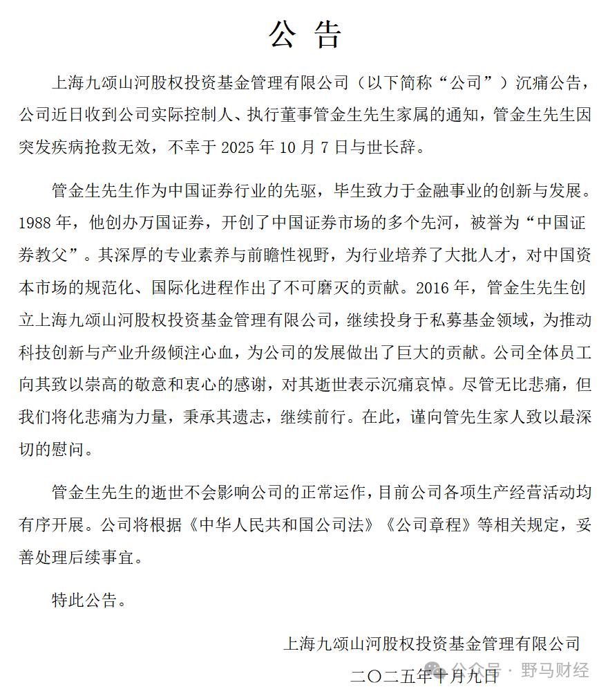 10月9日深夜,上海九颂山河股权投资基金管理有限公司(下称“九颂基金”)发布公告,公司实际控制人、执行董事管金生因突发疾病抢救无效,不幸于2025年10月7日与世长辞,享年78岁。