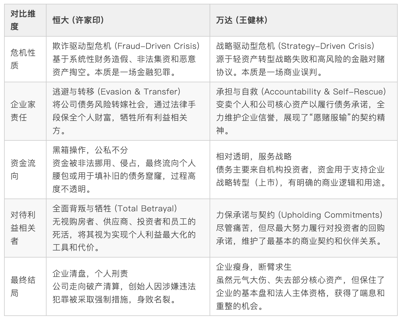 这场对比清晰地揭示了两者根本性的差异:许家印将恒大视作实现个人财富最大化的工具,其行为逻辑是“掏空公司,保全个人”;而王健林则将万达视作其毕生事业的载体,在危机面前选择了“牺牲部分,保全整体”。 这种价值观上的云泥之别,最终决定了他们截然不同的应对方式和历史定位。