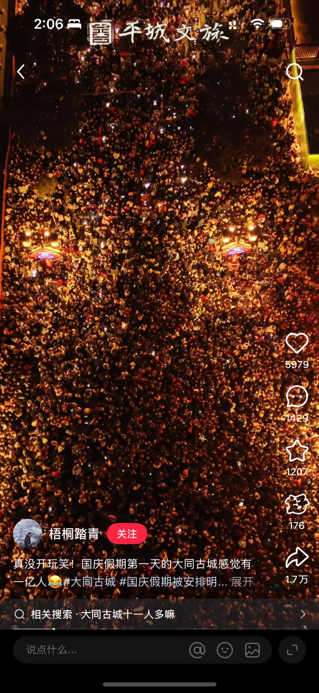 乍一看好像辣椒油,不过这个是大同。大家在古城里等着看无人机表演,散场时堵得水泄不通,一位网友说好不容易走到停车场,排了一个小时队才把车开出来,三个小时后才吃上晚饭。