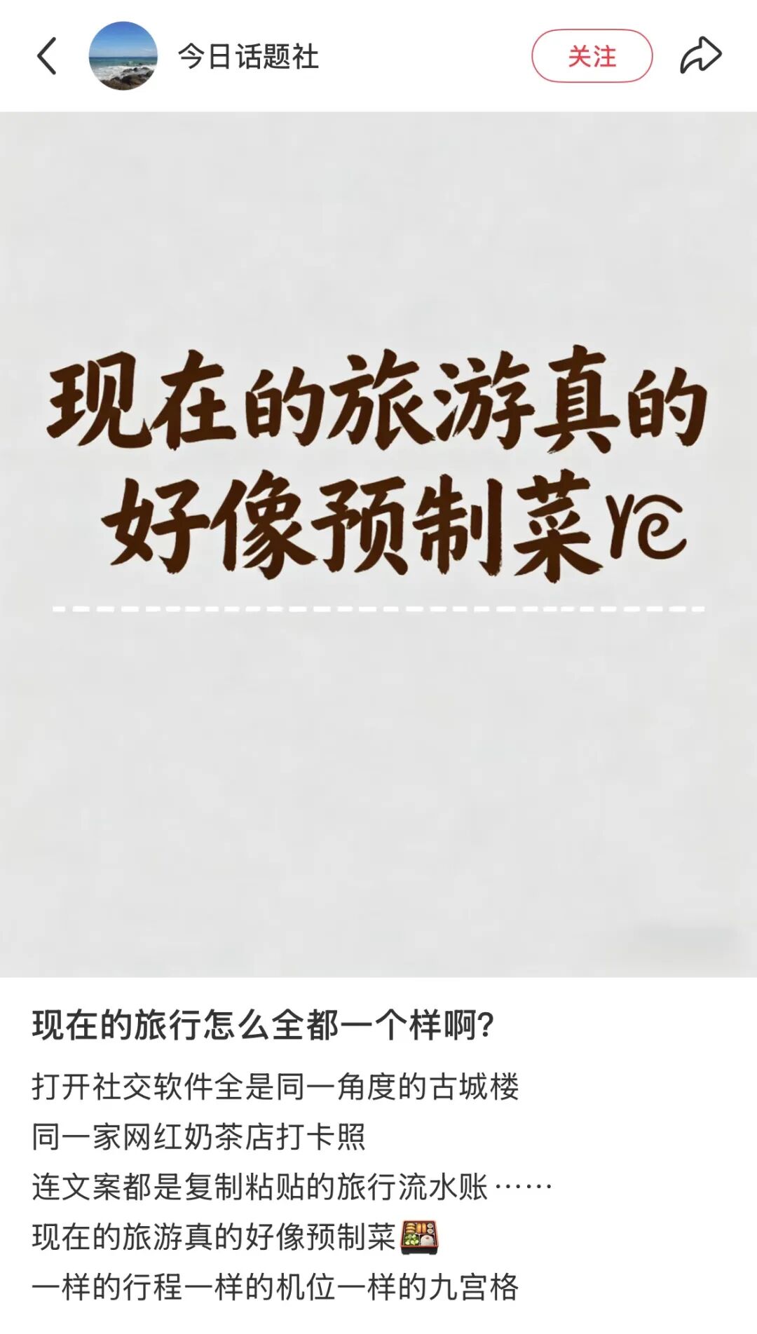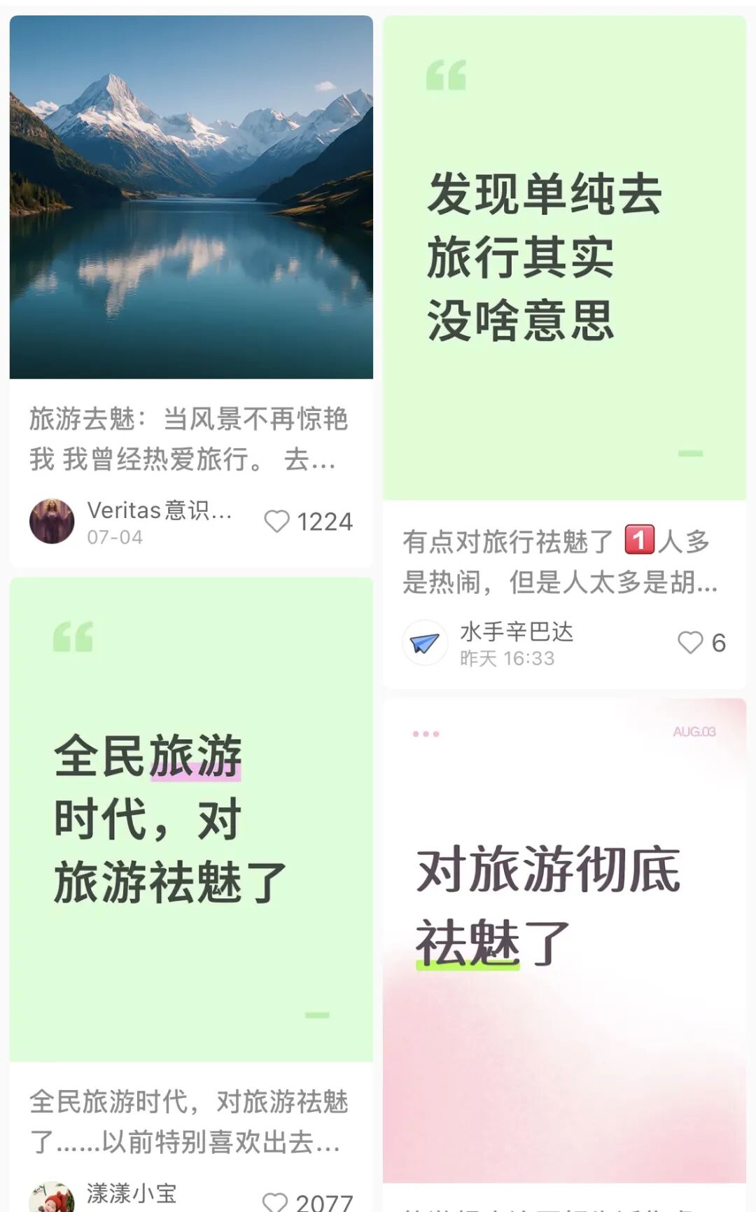 当旅行被算法规划、被消费逻辑重新定义,它的未知性与自发性也在一点点消失,人们会对旅游祛魅,也没什么好奇怪的。