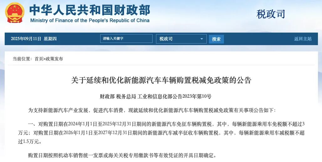 2023年6月,财政部、税务总局、工信部等三部门发布的《关于延续和优化新能源汽车车辆购置税减免政策的公告》明确,对购置日期在2026年1月1日至2027年12月31日期间的新能源汽车减半征收车辆购置税。目前车辆购置税税率为10%,新能源汽车减半征税意味着实际税率为5%。