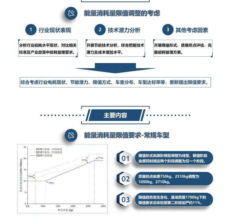 《电动汽车能量消耗量限值第1部分:乘用车》(GB 36980.1—2025)中明确,常规车型能量消耗量限值要求为,整车质量拐点由原750kg、2510kg调整为1090kg、2710kg。电能消耗量限值,基准质量1780kg下的限值要求总体较原第二阶段加严约11%。