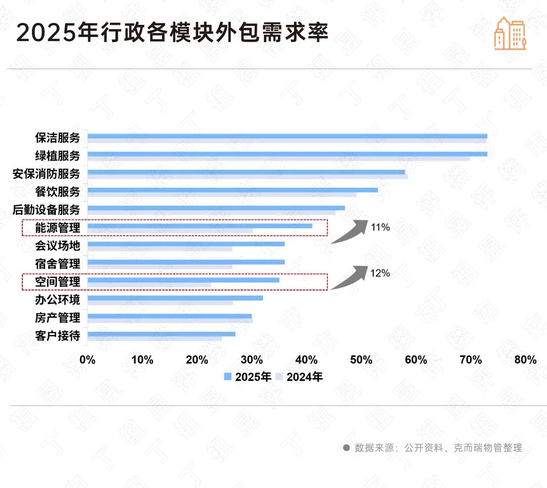 调研数据显示,在2025年的行政各模块外包需求中,能源管理和空间管理的增长幅度最为显著,分别达到了11%和12%。