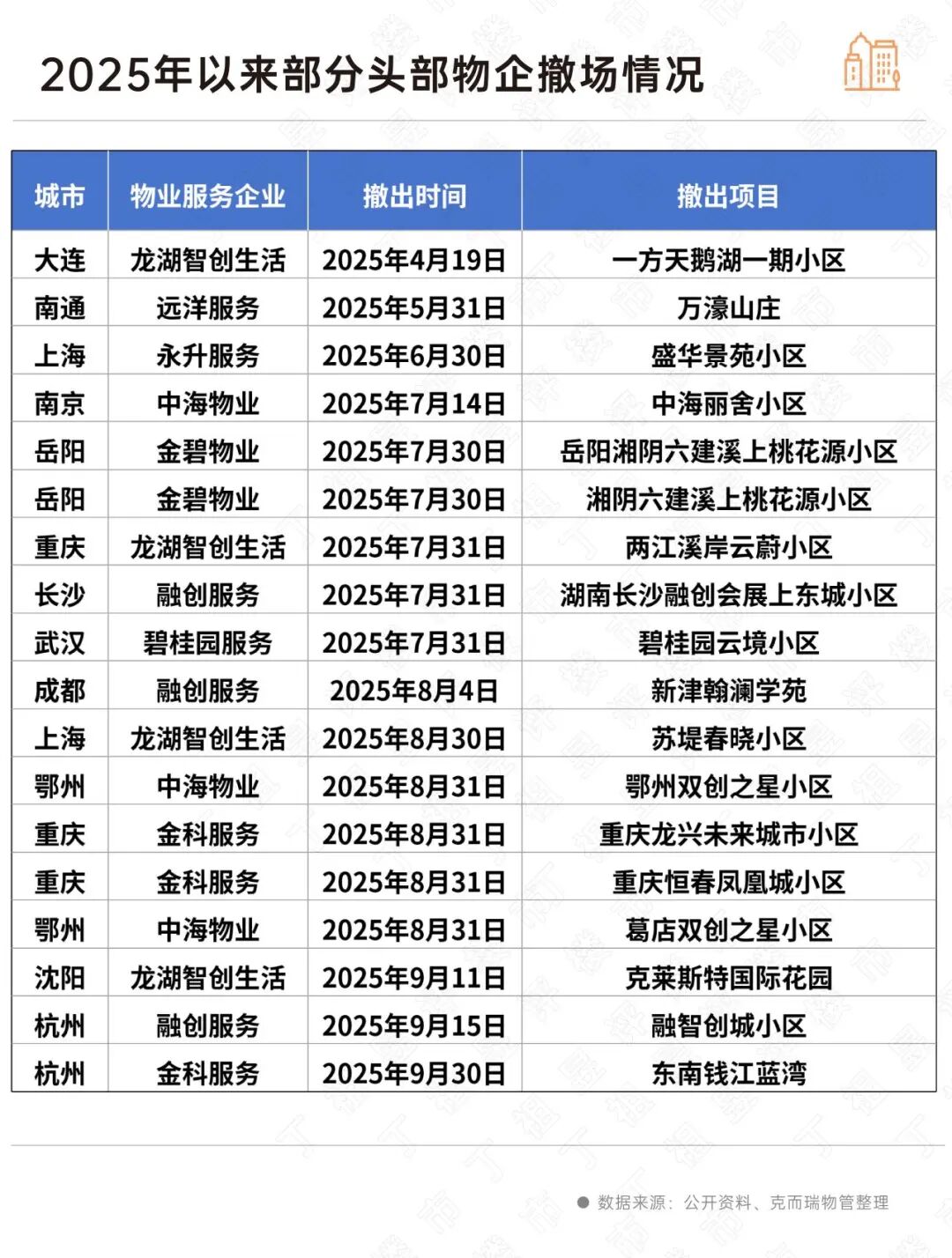 克而瑞物管统计,2025年物业企业主动退出项目的现象显著增多,仅7-8月,公开披露主动撤场的项目已近50个,龙湖智创生活、中海物业、碧桂园服务、金碧物业、融创服务、金科服务等头部物企也在其中。
