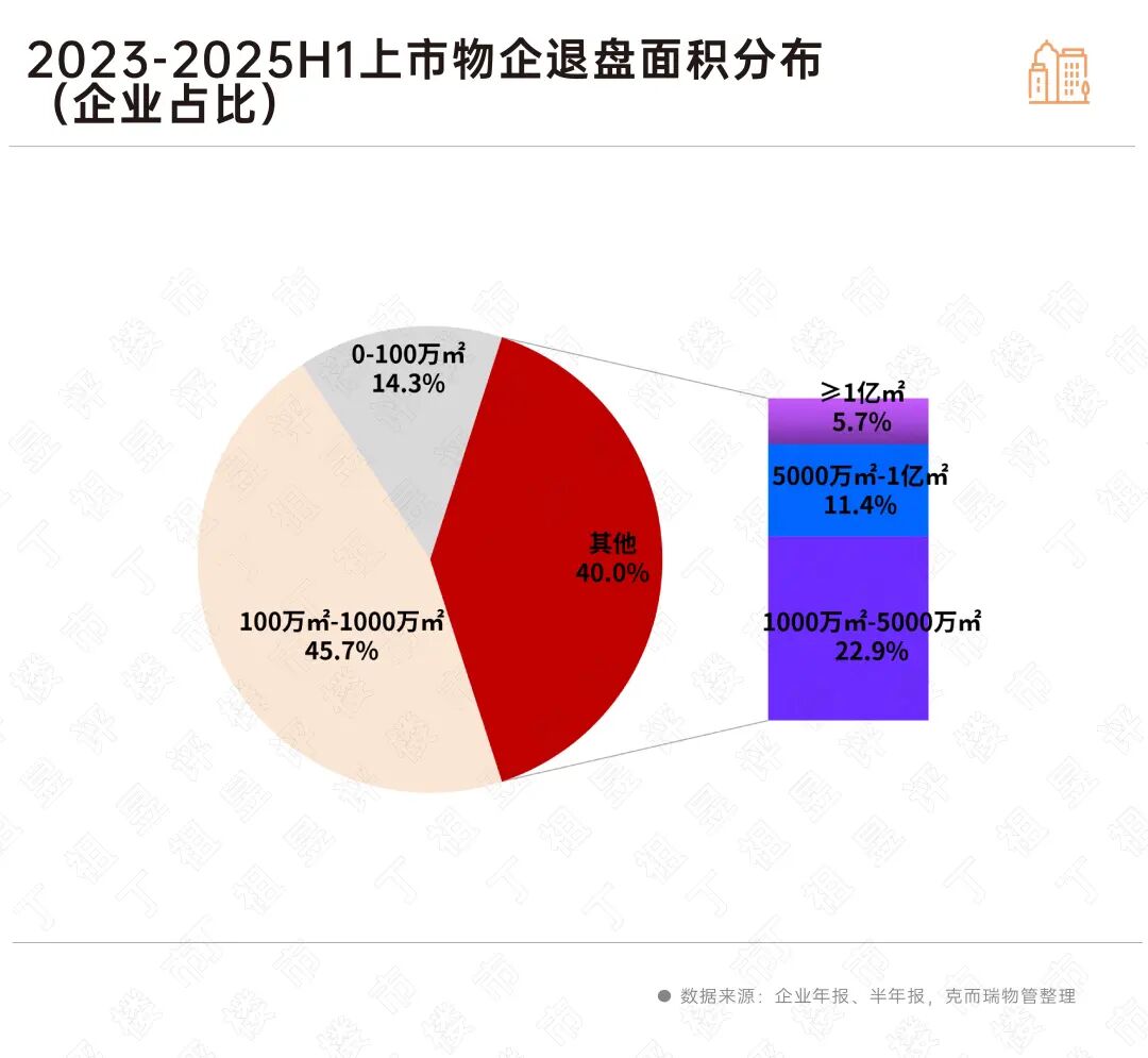 据克而瑞物管统计,2023年至2025年中期,35家上市物业服务企业累计退出管理面积超8亿平方米,其中四成企业退盘面积超过千万平方米。其中,彩生活、世茂服务退盘规模居前,近三年累计退出合约管理面积分别达1.5亿平方米和1.3亿平方米。