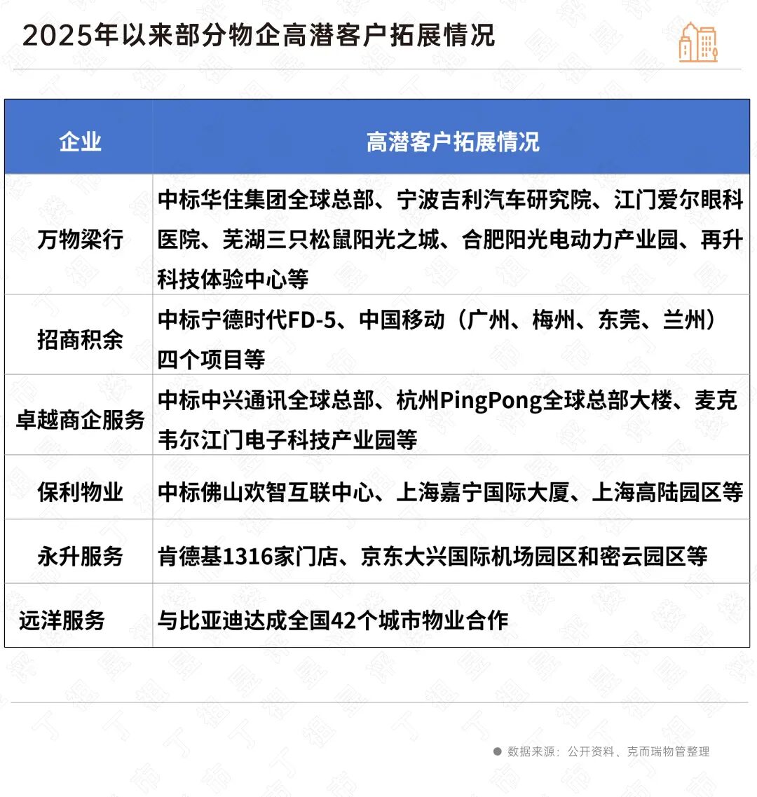 2025年以来,头部企业拓展成效显著,如万物梁行中标华住集团全球总部、宁波吉利汽车研究院、卓越商企服务斩获中兴通讯全球总部等。