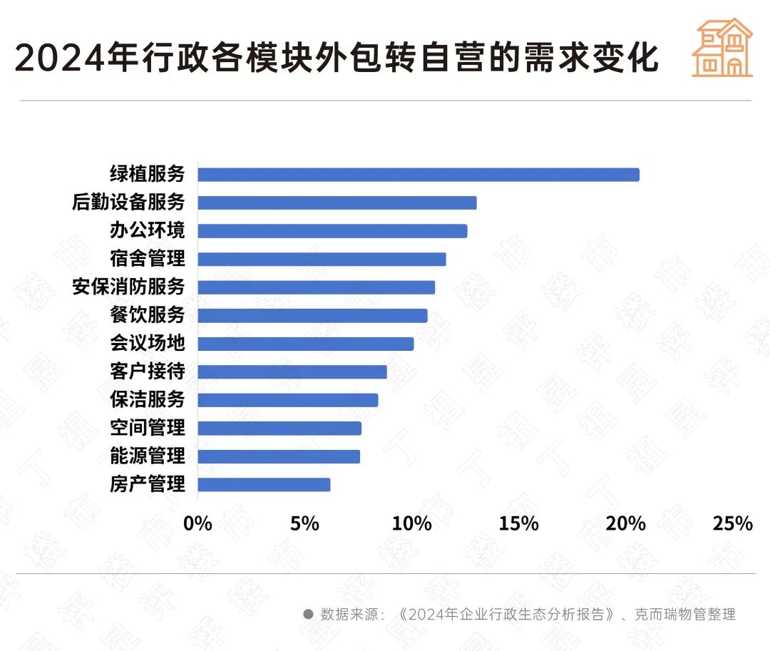 甲方压力向后端传导,部分企业为降本推动外包转自营。据克而瑞物管《2024年企业行政生态分析报告》,各类业务均现此趋势,其中绿植服务转自营需求最高。