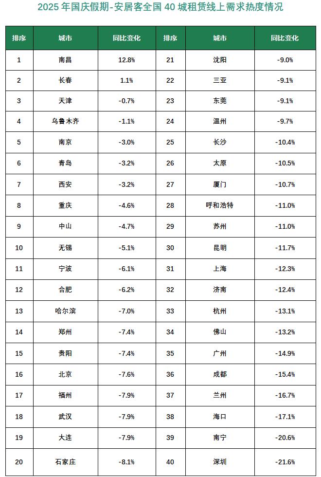 根据58安居客研究院的监测数据,2025年国庆假期期间,40个重点城市的租赁平均挂牌租金约为38.1元/平方米/月,较假期前一周(即9月底)上涨了约1%。