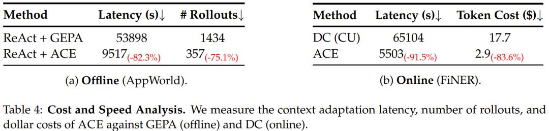 最后,该团队也分析了 ACE 的成本与延迟,发现这两个指标都有显著下降:ACE 通过增量更新与轻量化合并机制,使适应延迟平均降低 86.9%,并减少了生成消耗。