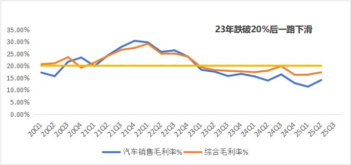 2023年-2025H1,其毛利率分别为18.25%、17.86%和16.81%,相比2022年25.6%的峰值水平降幅接近10个pct;其中,汽车销售毛利率更是从2022年的26.2%一路下滑到12.8%,不仅创下了近年新低,降幅更是接近14个pct。