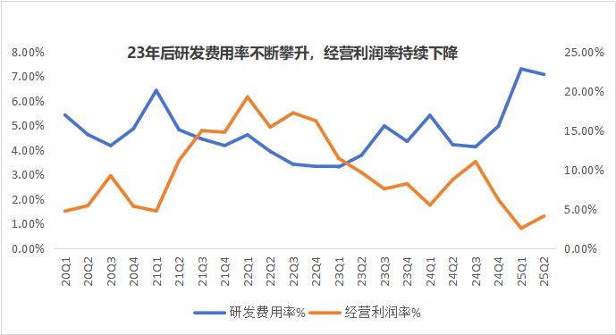 更值得关注的是,在毛利率不断下滑,叠加新车型开发、自动驾驶、Robotaxi等业务巨额的研发费用消耗下,更能反映特斯拉真实盈利能力的经营利润率也出现了急速下降。2025年上半年,特斯拉的经营利润率缩窄到了3.4%,相比2022年巅峰时期的17%,降幅已经超过了13个百分点,给其未来降价的可持续性带来了严峻挑战。