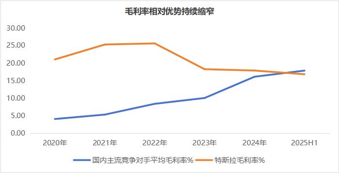 从对比数据上看,2023年开始,特斯拉相对于国内主流竞争对手的毛利率平均优势从近20个点不断缩窄到不足2个点,而25年上半年更是不敌行业平均水平,出现了1个点的落后。同期,对比比亚迪、理想等国内头部车企,其毛利率已经连续三年被反超。