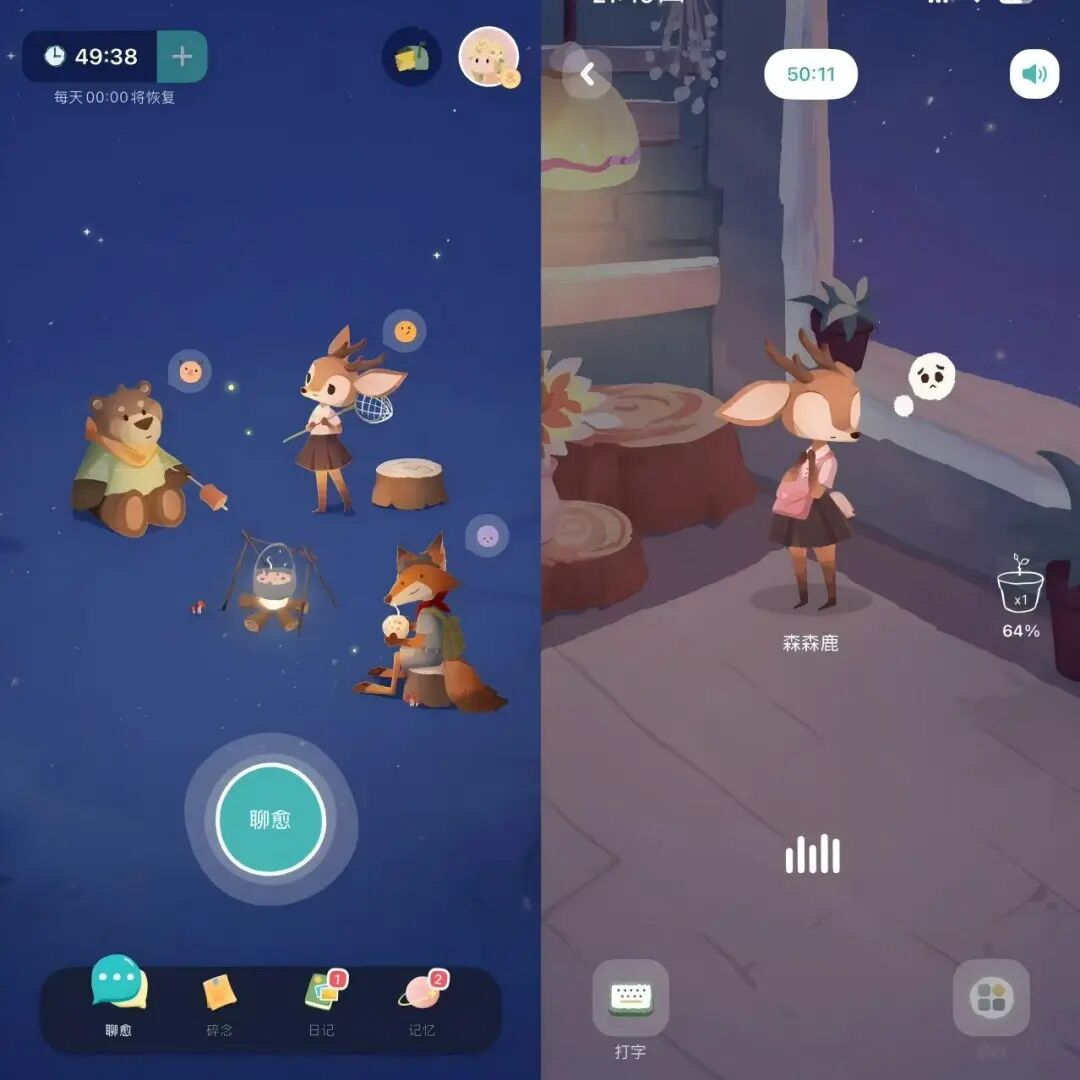 这些产品的典型特征是大多具备1-2个差异化特点,能吸引用户「留」下来。比如「LoveyDovey」涵盖了包括二次元、KPOP等丰富的角色IP库,抓住追星人群的心理特点,搭建阶梯式的好感养成机制,能满足她们的陪伴价值。「林间聊愈室」则是以动物的非拟人化形象,以游戏化的方式帮助用户分析情绪。