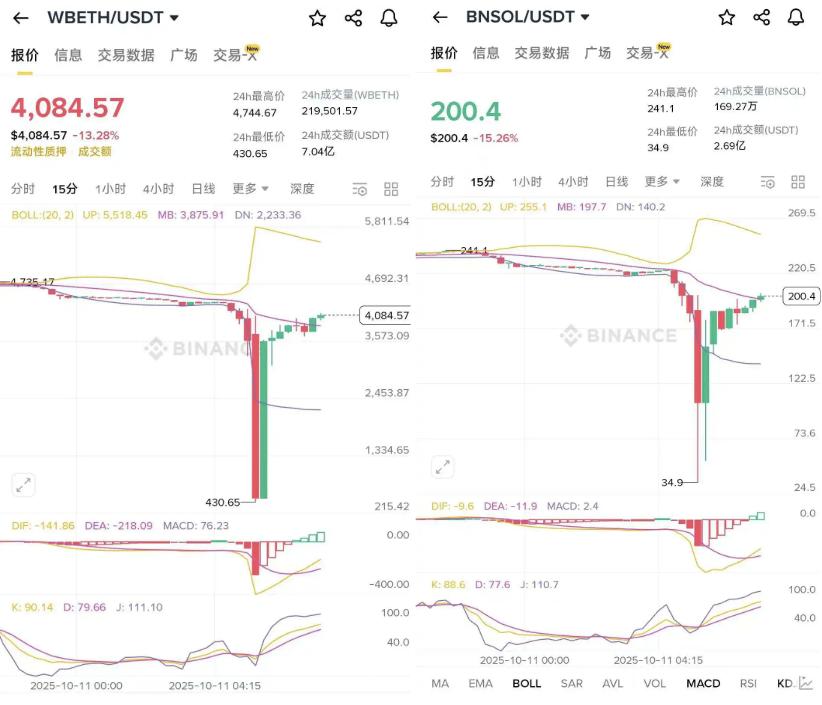 在这次下跌中,币安推出的质押理财产品 WBETH、BNSOL 也出现大幅脱锚,其中 WBETH 最低跌至 430.65 美元,BNSOL 从 213 美元最低跌至 34.9 美元,目前二者已回升至公允价格。