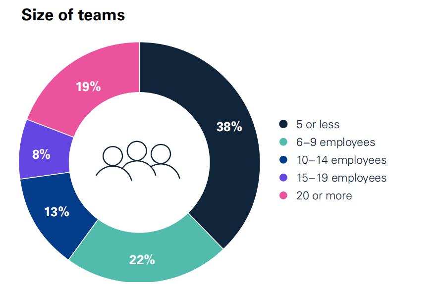 家办团队规模:大多数家办的员工人数少于5人(38%),19%的家办拥有20名或以上员工。具体来看:38%拥有5名或以下员工;22%拥有6–9名员工;13%拥有10–14名员工;8%拥有15–19名员工;19%拥有20名或以上员工。