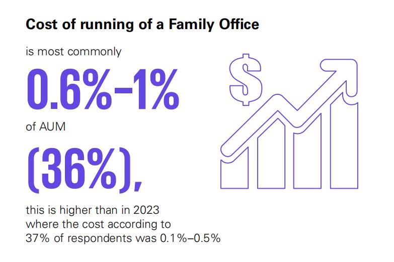 家办运营成本:家办最常见的运营成本区间为AUM的0.6%–1%(36%),这一比例高于2023年,当时37%的受访者表示成本为AUM的0.1%–0.5%。