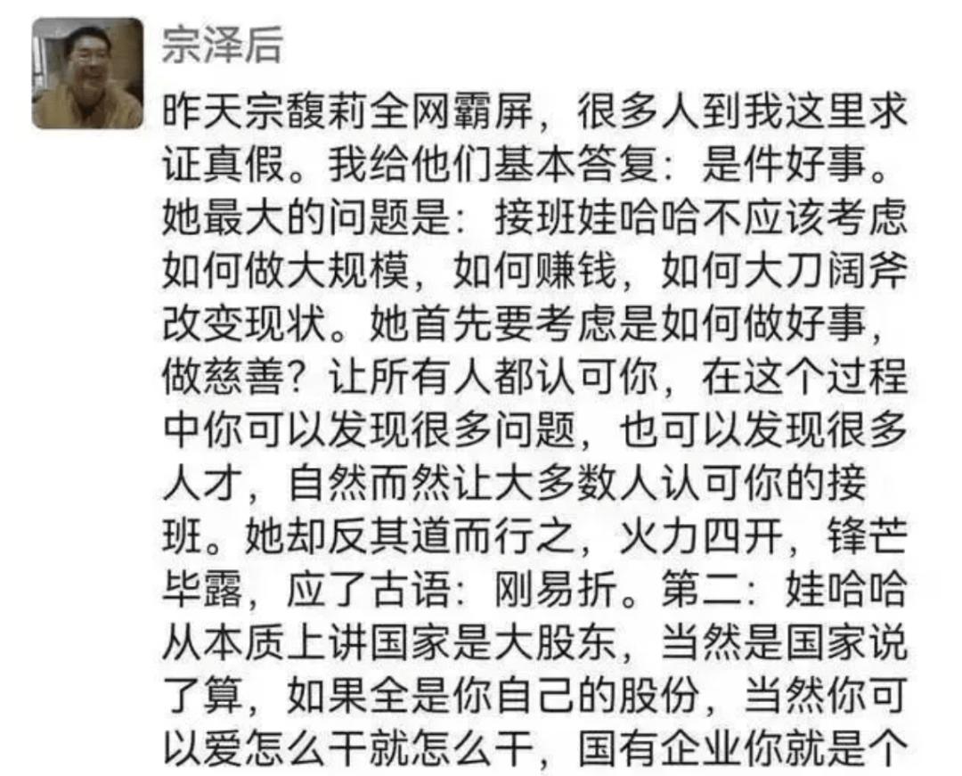对此,宗泽后曾在朋友圈中写道,“她(宗馥莉)最大的问题是:接班娃哈哈不应该考虑如何做大规模,如何赚钱,如何大刀阔斧改变现状。她首先要考虑是如何做好事做慈善?让所有人都认可你,在这个过程中你可以发现很多问题,也可以发现很多人才,自然而然让大多数人认可你的接班。她却反其道而行之,火力四开,锋芒毕露,应了古语:刚易折。”