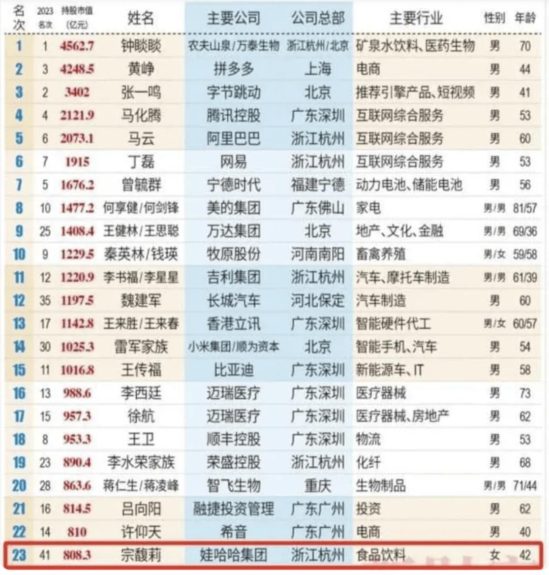 在《2024新财富500富人榜》中,宗馥莉以808亿元的身价首次登顶中国女首富宝座。