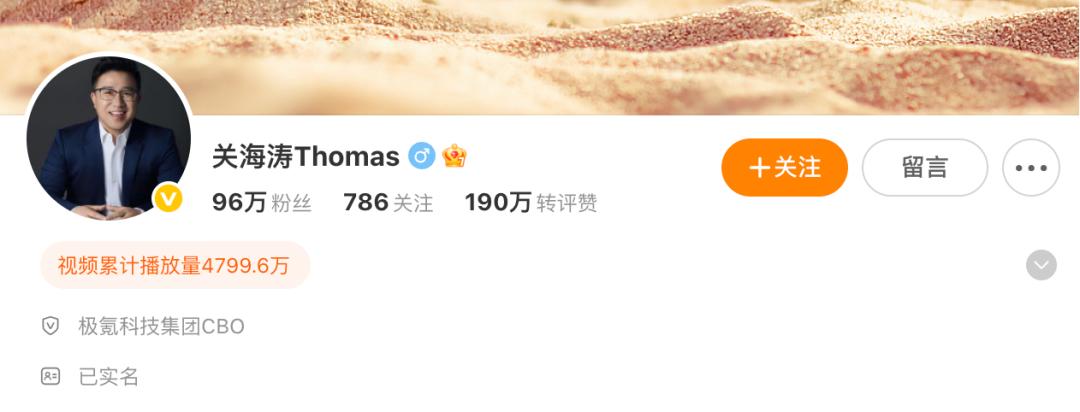 也不是空穴来风,首先因为关海涛个人微博的名称,去掉了“极氪”二字,但认证仍然保留极氪科技集团CBO。
