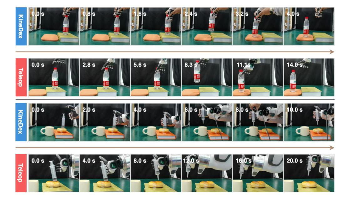 在瓶盖旋紧、牙膏挤压、注射器按压等九项复杂任务中,KineDex平均成功率达74.4%,且数据采集效率相较于遥操提升两倍以上。