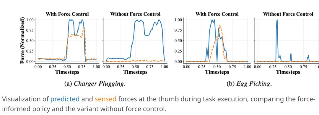 消融实验结果表明,力控模块的缺失会显著影响系统性能。当禁用该模块时,所有任务的平均成功率骤降至16.7%,即使如瓶体抓取等简单任务也难以完成。缺乏力控的灵巧手往往仅接触物体表面而未施加足够压力,导致接触密集型任务频繁失败。