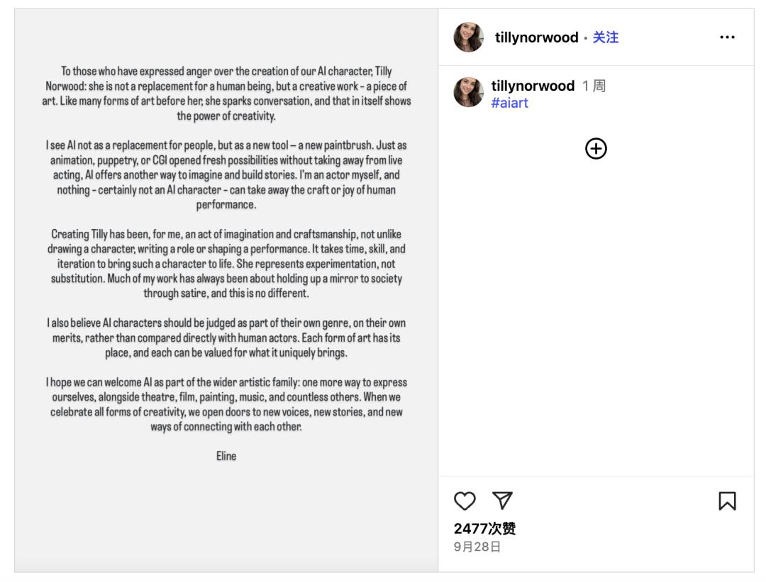 Tilly Norwood的出现,⽆疑是往尚未愈合的伤⼝上撒盐。