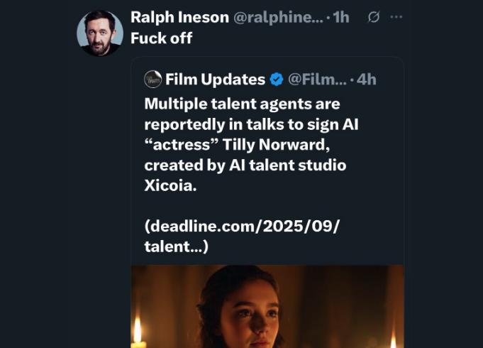 Van der Velden在公开分享了Tilly Norwood的即将签约经纪公司的消息后,基本上在业界获得了一边倒的批评。