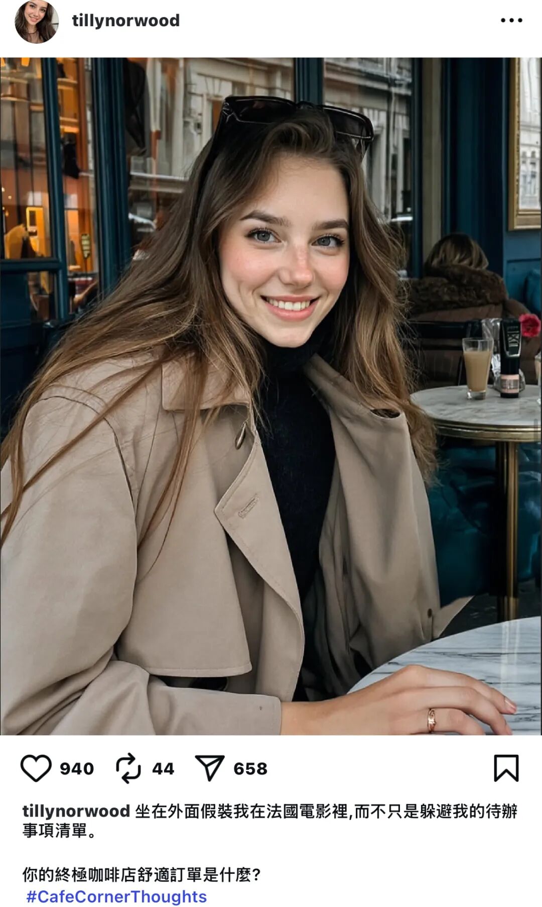 表面上看,TillyNorwood是⼀个有着深邃眼眸、波浪棕发的年轻⼥性,Instagram上的⼈设是热爱“冰咖啡”的Z世代⼥孩,⽇常分享着试镜和⽚场⽣活,看起来和⽆数追梦的年轻演员别⽆⼆致。