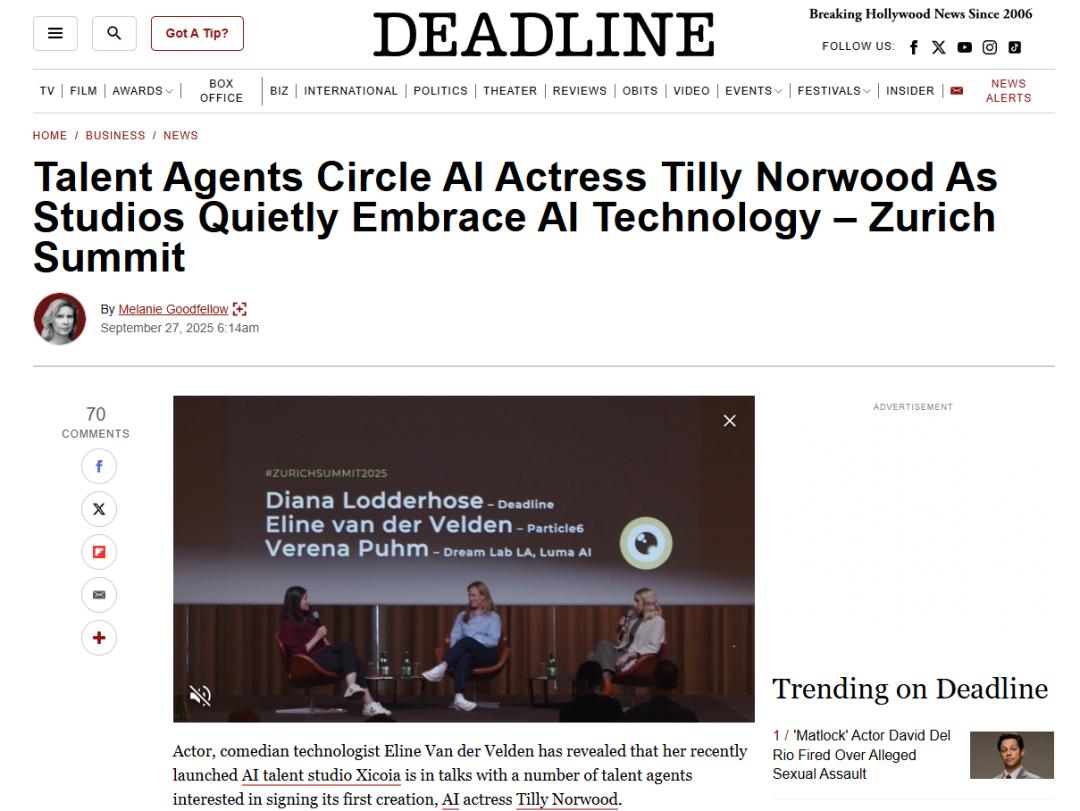 9⽉底,在瑞⼠苏黎世电影节的⼀场⾏业峰会上,Particle6公司的创始⼈兼 CEO Eline Van der Velden高调宣布,⼀个名叫Tilly Norwood的“AI⼥演员”正获得多家好莱坞经纪公司的⻘睐,签约在即。