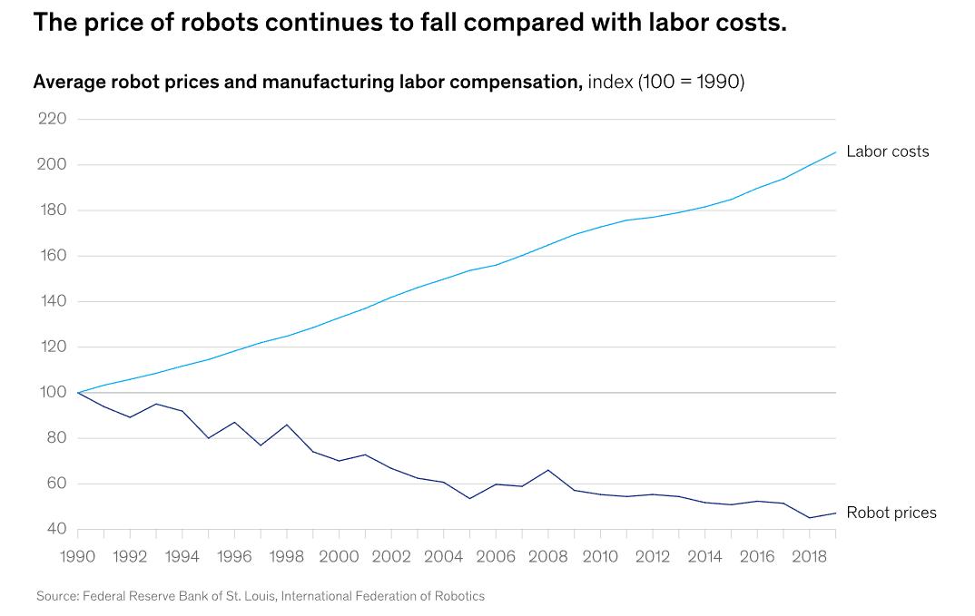 在过去30年里,机器人的成本降低了50%以上