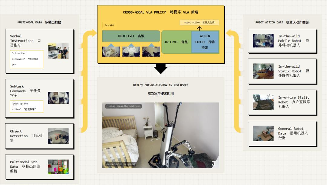 与此同时,Physical Intelligence的π0.5模型已经在未见过的家居环境中,让机器人完成「清理厨房或卧室」这样复杂且延展性的家务。