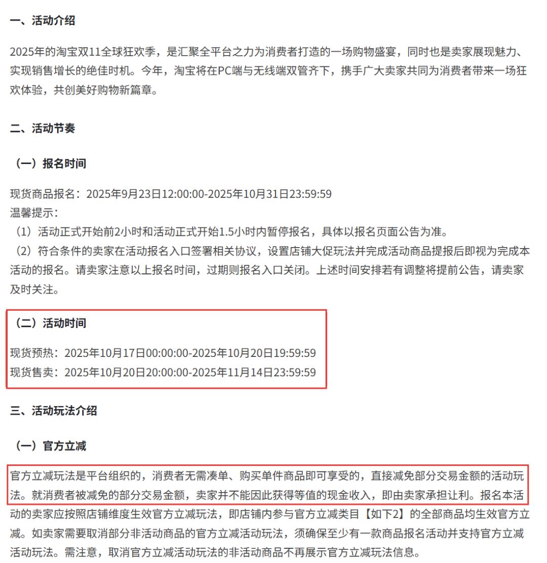 淘宝、天猫的调整力度更为突出,取消了以往多轮预售与现货的复杂模式,将核心玩法聚焦为“官方立减”,即消费者无需凑单,购买单件商品即可享受直接减免部分交易金额。
