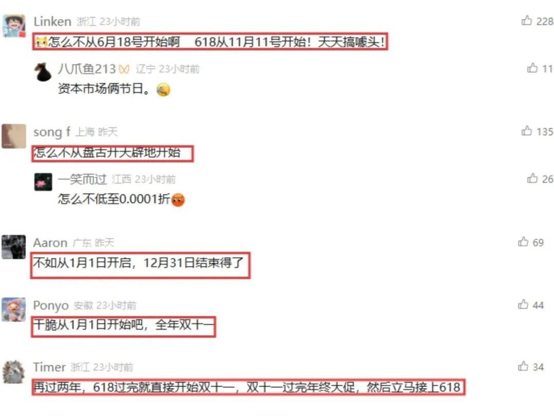 “怎么不从6月18日开始,618从11月11日开始!天天搞噱头!”“怎么不从盘古开天辟地开始。”