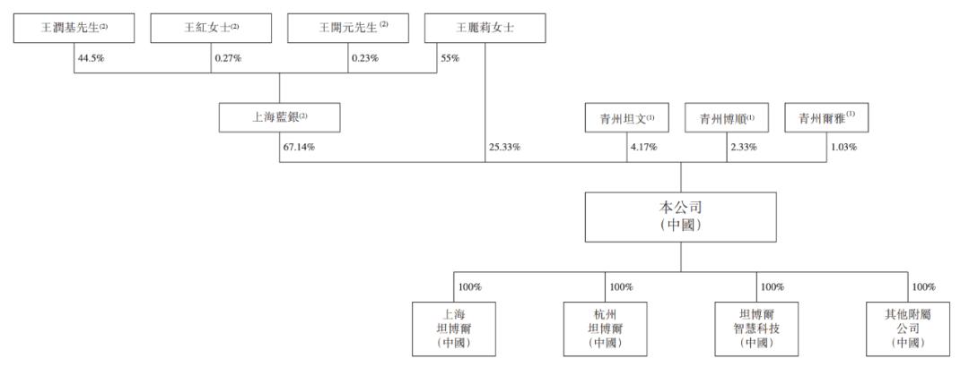 2022年12月,创始人王勇萍辞任公司董事,其妻王丽莉成为坦博尔新的掌舵人。招股书显示,坦博尔在香港上市前的股东架构中,王丽莉女士直接及间接合计持股约96.64%,为公司的控股股东;其他股东包括雇员激励平台青州博顺、青州尔雅,分别持股2.33%,1.03%。