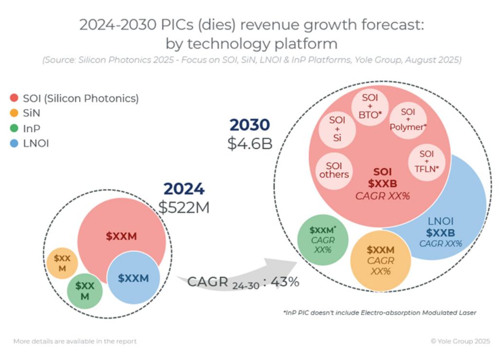 从市场需求端看,硅光产业的增长动力已从“增量需求” 转向 “爆发式需求”。根据Yole 最新报告《硅光子 2025—— 聚焦 SOI、SiN、LNOI 和 InP 平台》,硅光子行业正进入快速增长与多元化发展的关键期:人工智能持续推动带宽需求呈指数级上升,倒逼行业向更高数据速率转型 —— 预计 200G / 通道链路将在 2026-2027 年成为主流,并为 800G、1600G 收发器的规模化应用铺平道路。这类高带宽解决方案,恰好匹配超大规模数据中心与 AI 集群对 “高速率 + 高能效” 的双重需求,成为硅光技术商业化落地的核心场景。