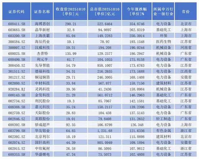 其中,23家上市公司股价成功实现翻倍,海博思创(688411.SH)、晶华新材(603683.SH)、上海洗霸(603200.SH)位居前三,年内股价涨幅均超过200%。