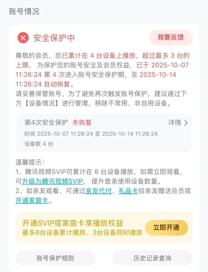 “腾讯视频对同一账号的登录及播放设备数量进行了限制。当系统检测到使用设备数超出限制时,会暂时开启安全保护功能,期间无法播放VIP影视剧集。”腾讯客服人员表示,账号有两次手动解除保护机会,次数用完后需等待保护期结束后才能恢复。