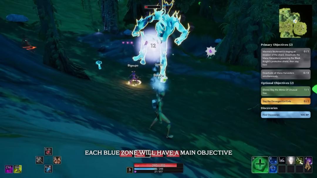 最有新意的部分是「蓝区」,这里像是放大版的每个玩家的家园。这里加入了探索和生存建造玩法,里面的资源属于每个玩家自己,玩家可以邀请其他玩家来到自己的蓝区一起游戏。蓝区的战斗还加入了roguelike元素,并且世界会根据玩家的行为实时地发生变化。