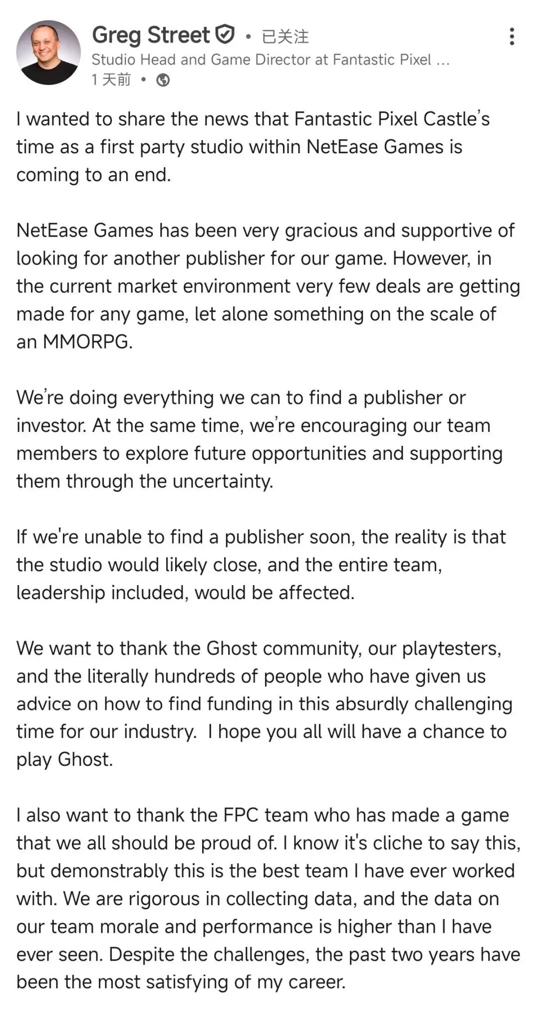 网易在海外的第一方工作室Fantastic Pixel Castle Studio创始人Greg Street昨日(10月10日)在领英发文,宣布该工作室「作为网易游戏旗下第一方工作室的阶段即将结束」。工作室当前正全力寻找新的发行商和投资者,如果短期内没能找到,工作室可能不得不整体关闭。
