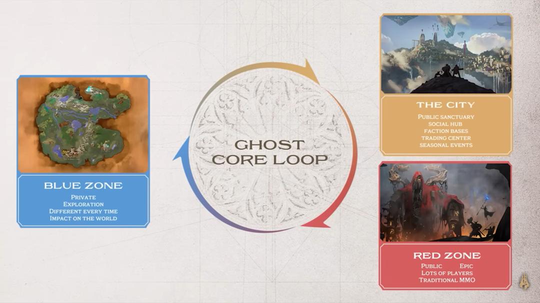 据介绍,这款游戏的创新之处在于尝试解决MMO游戏逐渐单机化的问题。游戏整体分为了三个部分,分别承担不同的功能。城市是社交和交易的中心,「红区」则承担了传统MMO的多人合作副本功能,提供挑战性。