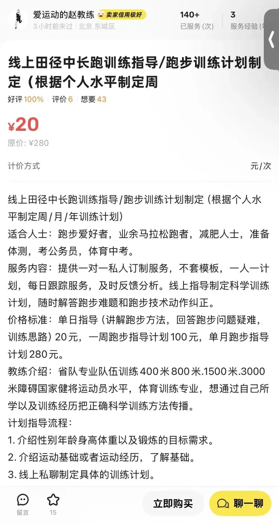 《北京商报》记者调查发现,马拉松教练通常按课时收费,一小时为一个课时,每小时收费在400—800元。要是连续报10节课,能享受3000~5000元的优惠价。