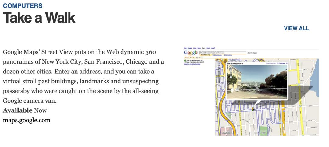 “在网上放置纽约、旧金山、芝加哥等城市的动态360度全景图。输入地址,你就能虚拟漫步经过建筑物、地标,以及被谷歌全能相机车捕捉到的毫无防备的路人。”最初只覆盖部分城市,现在已经跨越110个国家和地区的1200万英里道路。