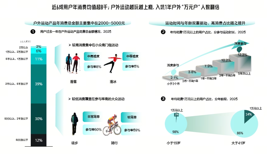 Z世代在户外运动消费正展现前所未有的活力,追求“硬核体验”和“情绪价值”双重满足的他们,迅速成为户外运动的主力人群。近6成户外用户年装备消费金额超过8000元,并随着入坑时间增长,投入花费更多,入坑1年以上用户中,人均消费过万的用户数增长了1倍。96%用户表示未来会持续花费,近三成用户表示会加大装备的持续投入。